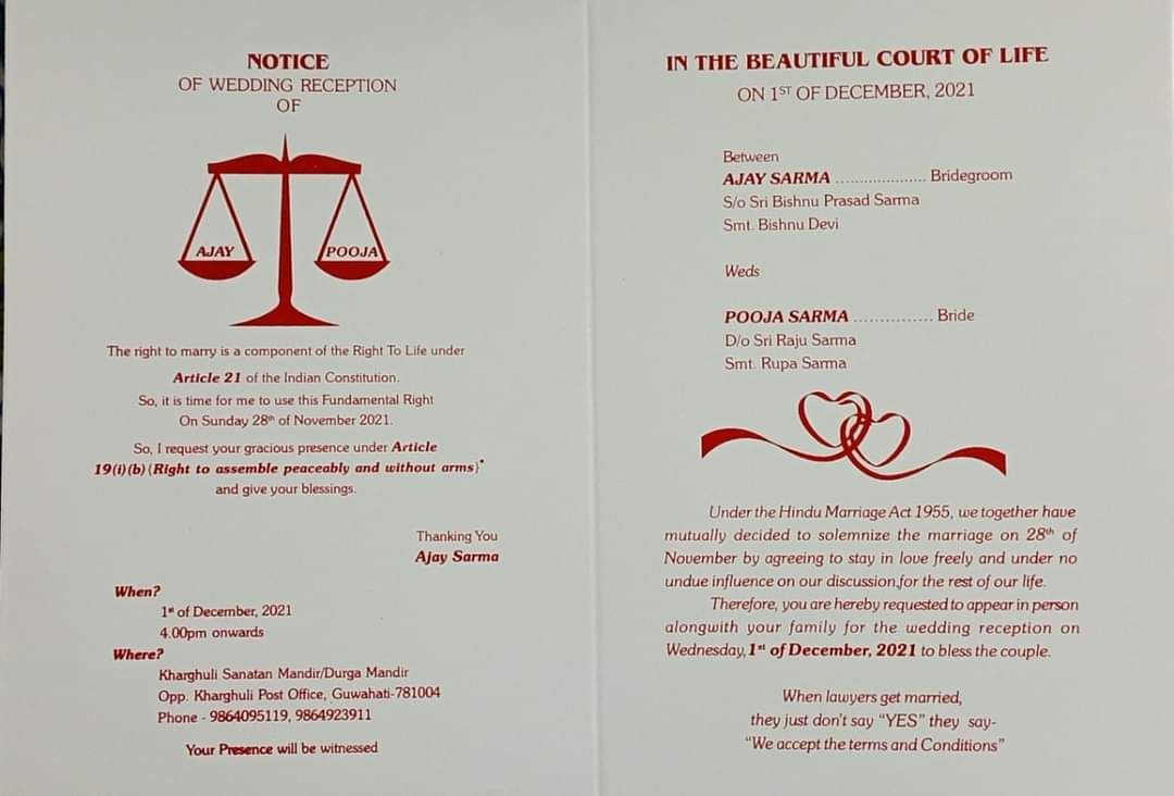 शादी 28 नवंबर को है और शादी के कार्ड में कैप्शन लिखा है" In The Beautiful Court of Life" इस लाइन के नीचे अब न्यौता भी पढ़िए जो बेहद रोचक है। " Notice Of Wedding Reception" और इसके ठीक नीचे न्याय का प्रतीक चिन्ह तराजू बना है जिसमे दूल्हा दुल्हन के नाम छपे है। तराजू में नाम छपवाने का उद्देश्य पति पत्नी को मिलने वाला समानता का अधिकार है। इसी के साथ कार्ड में आगे उन कानूनों का भी जिक्र किया गया है, जो उन्हें विवाह का अधिकार प्रदान करते हैं,कार्ड में लिखा है- 'विवाह का अधिकार भारतीय संविधान के अनुच्छेद 21 के तहत जीवन के अधिकार का एक घटक है, इसलिए मेरे लिए इस मौलिक अधिकार का उपयोग करने का समय आ गया है।"