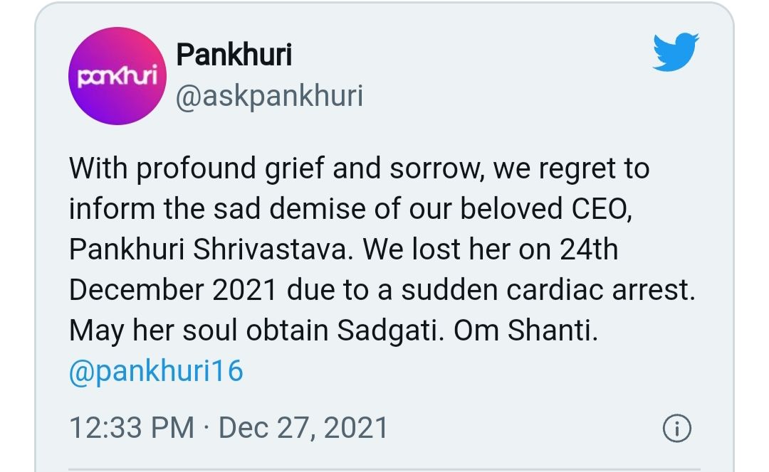 ‘पंखुड़ी’ के आधिकारिक ट्विटर हैंडल ने शोक संदेश जारी कर कहा है कि 24 दिसंबर को अचानक हार्ट अटैक आने से हमारी कंपनी की सीईओ पंखुड़ी श्रीवास्तव का निधन हो गया है. हाल ही में 2 दिसंबर 2021 को पंखुड़ी की शादी की पहली सालगिरह थी।